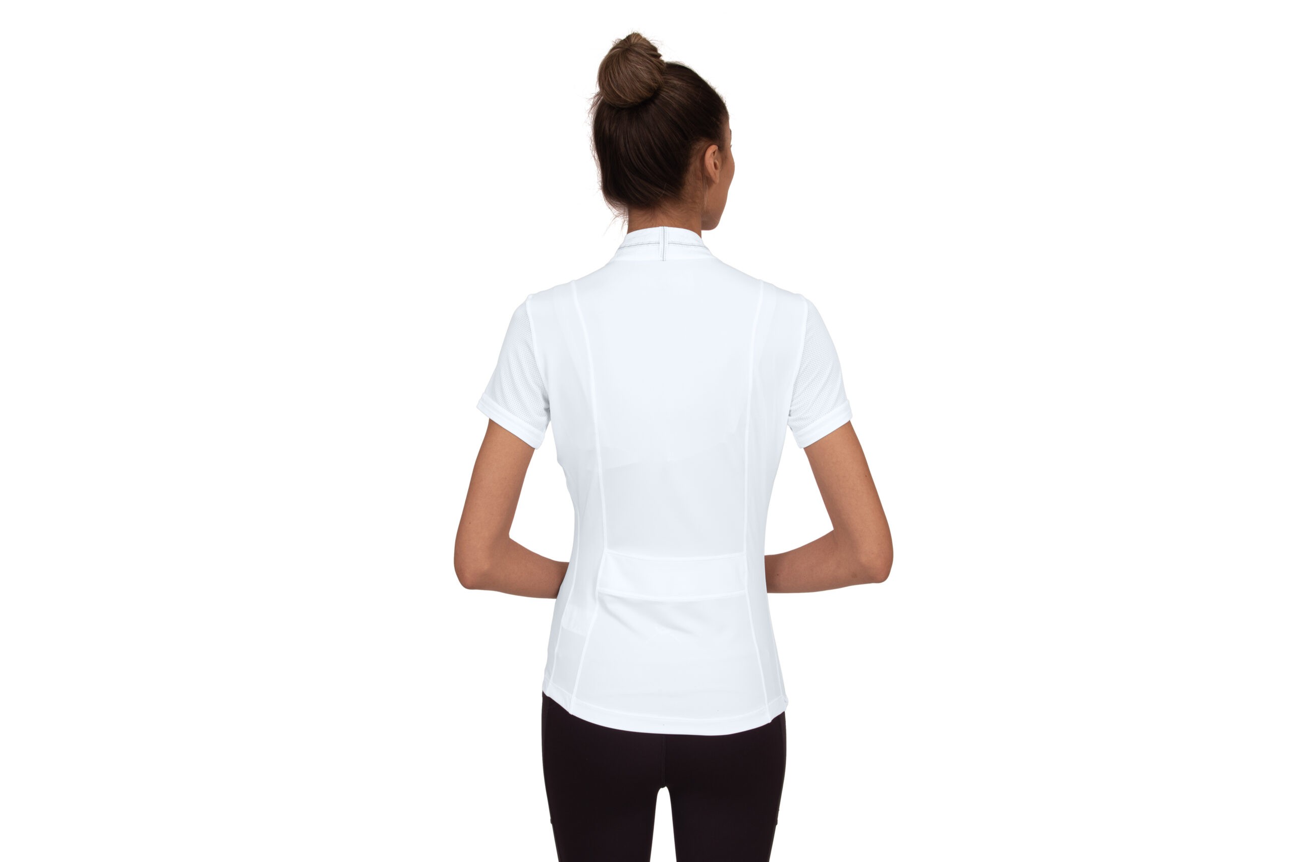 Our stunning SkyCool® Show Shirt has beautiful silver accents for extra feminine styling. The all mesh short sleeves provide plenty of stretch for freedom of movement, while adding immediate cooling. Our innovative no gape quarter zip placket design, and hidden snaps on the stand-up collar add a polished, finished look.